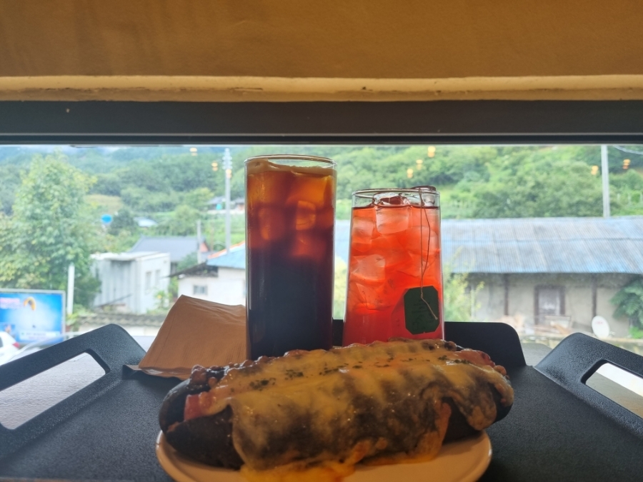 주문한 아메리카노랑 애플망고티 그리고 소시지빵.